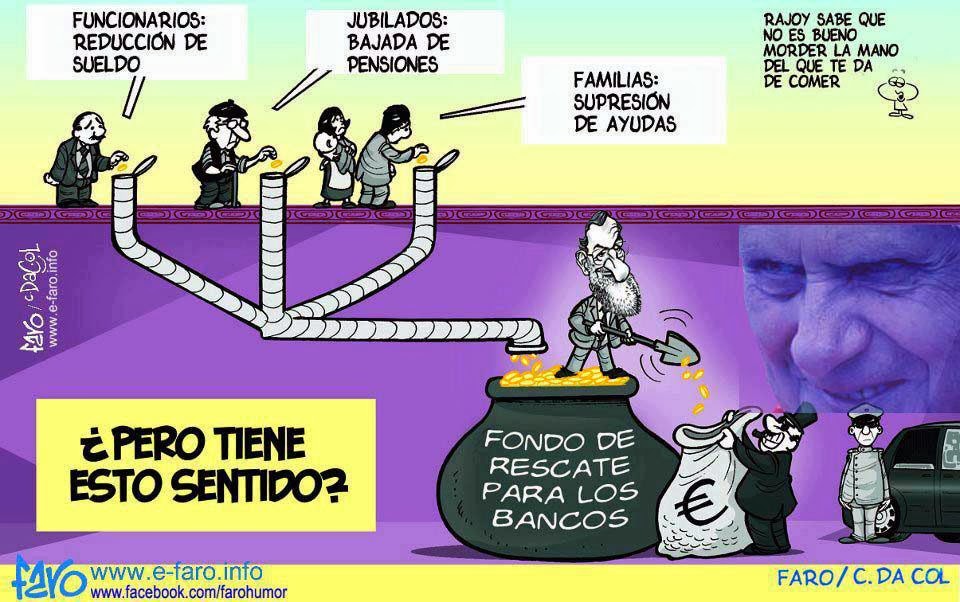 Creo que es muy fácil de entender como todo el dinero que recauda el estado se va por esas fisuras, como una presa llena de agua que filtra a chorros su contenido, todo ese dinero que se fue en rescates a la banca, corrupción y todo lo que nos están robando en nuestra propia cara. La consecuencia directa…recortes para los todos. Ya lo dijo cierto ministro “nos hemos cargado su sanidad” reconociendo que han usado mis impuestos (los tuyos y de todos también) para hacer lo que les ha salido de sus santos cojones, para robar dinero a espuertas y dejar al ciudadano de a pie al borde del abismo. (recomiendo ver el ultimo enlace detenidamente)